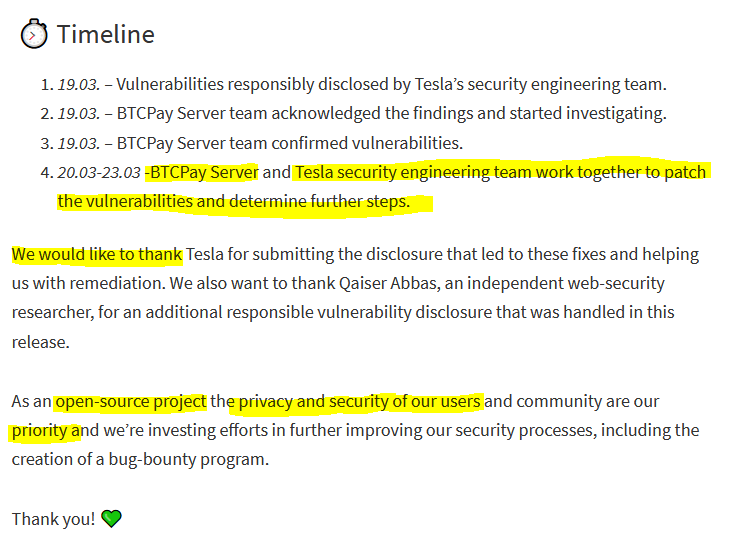 BTCPay Server is an open source payment processor used by thousands of merchants globally. It enables individuals and companies to receive bitcoin payments or donations. The great thing is, it's absolutely free, while any of the traditional payment processors take a cut of the sales. Tesla is using BTCPay to receive payments in its online shop and the security team found vulnerabilities in the code, which then were disclosed and patched together with the BTCPay team. Source
