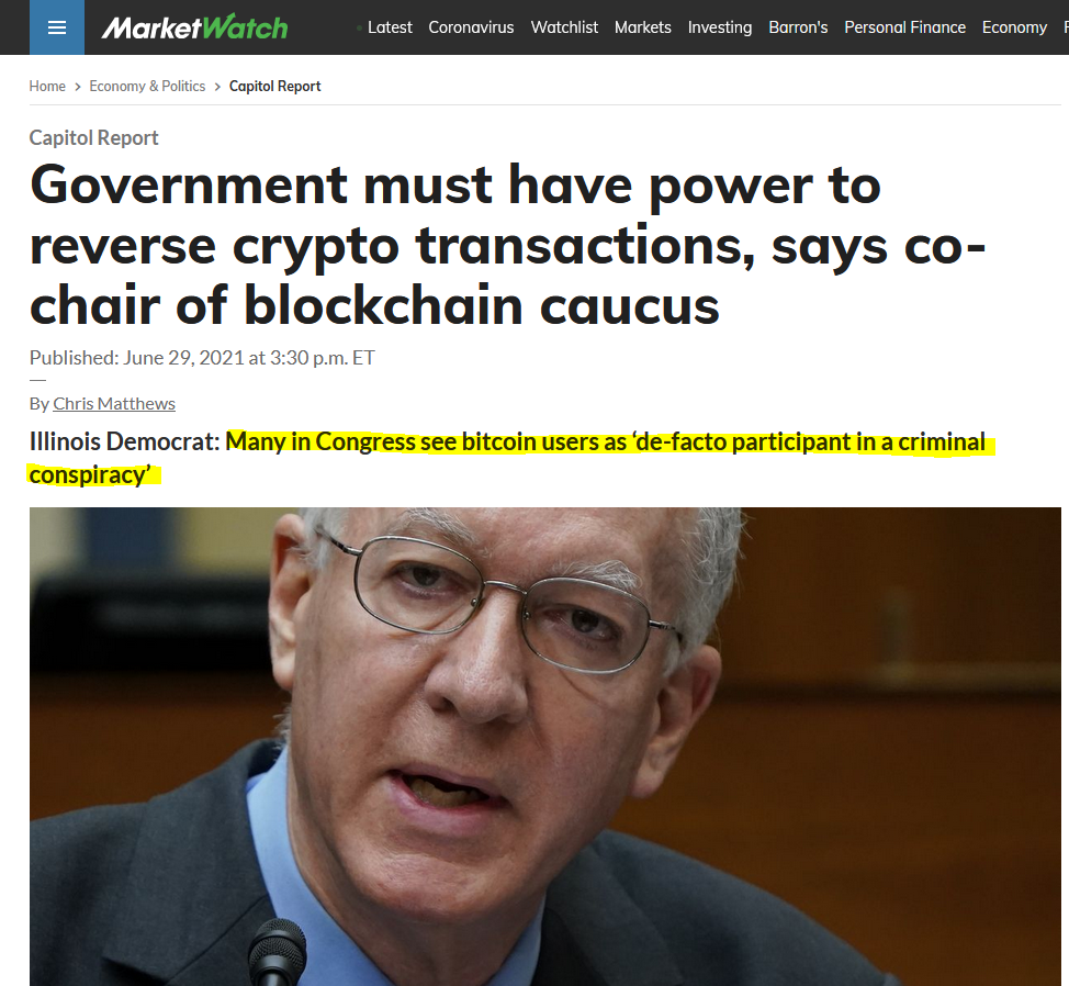 Democratic Rep. Bill Foster of Illinois, co-chair of the House blockchain caucus, said Tuesday that laws must be passed to allow federal courts to identify digital-asset holders and then reverse transactions in bitcoin or other digital currencies. Culminating in stating that "Many in Congress see bitcoin users as ‘de-facto participant in a criminal conspiracy’" - very nice thank you. To criminalize 100 million people, who just want to exchange money freely, in one sentence is quite an achievement.
